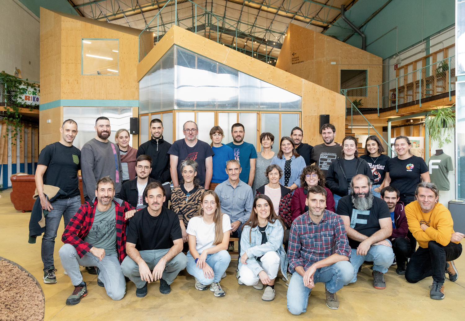 ARGIAk egunpasa egin zuen azaroan Aiaraldea Ekintzen Faktorian. Argazkian bateko eta besteko langileak eraikinaren sarreran. Argazkia: Dani Blanco / ARGIA CC BY-SA