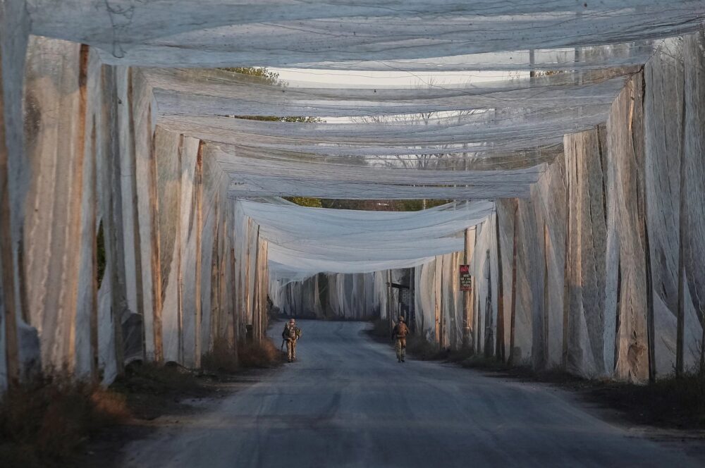 Argazkia: Droneen aurkako sareak Ukrainaren menpeko Donetsk-eko errepide batean. A. Stepanov / Reuters