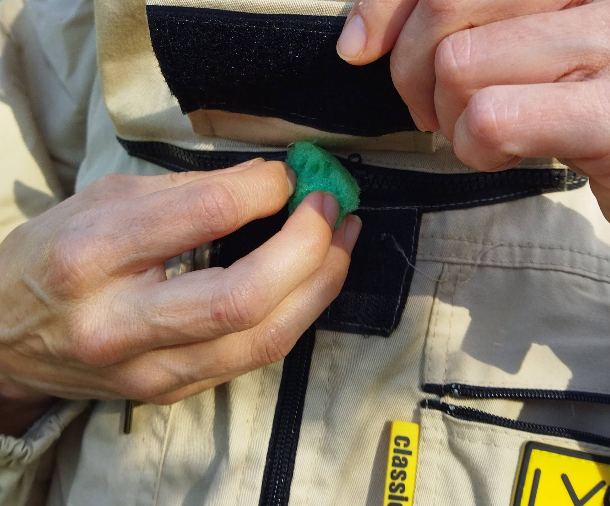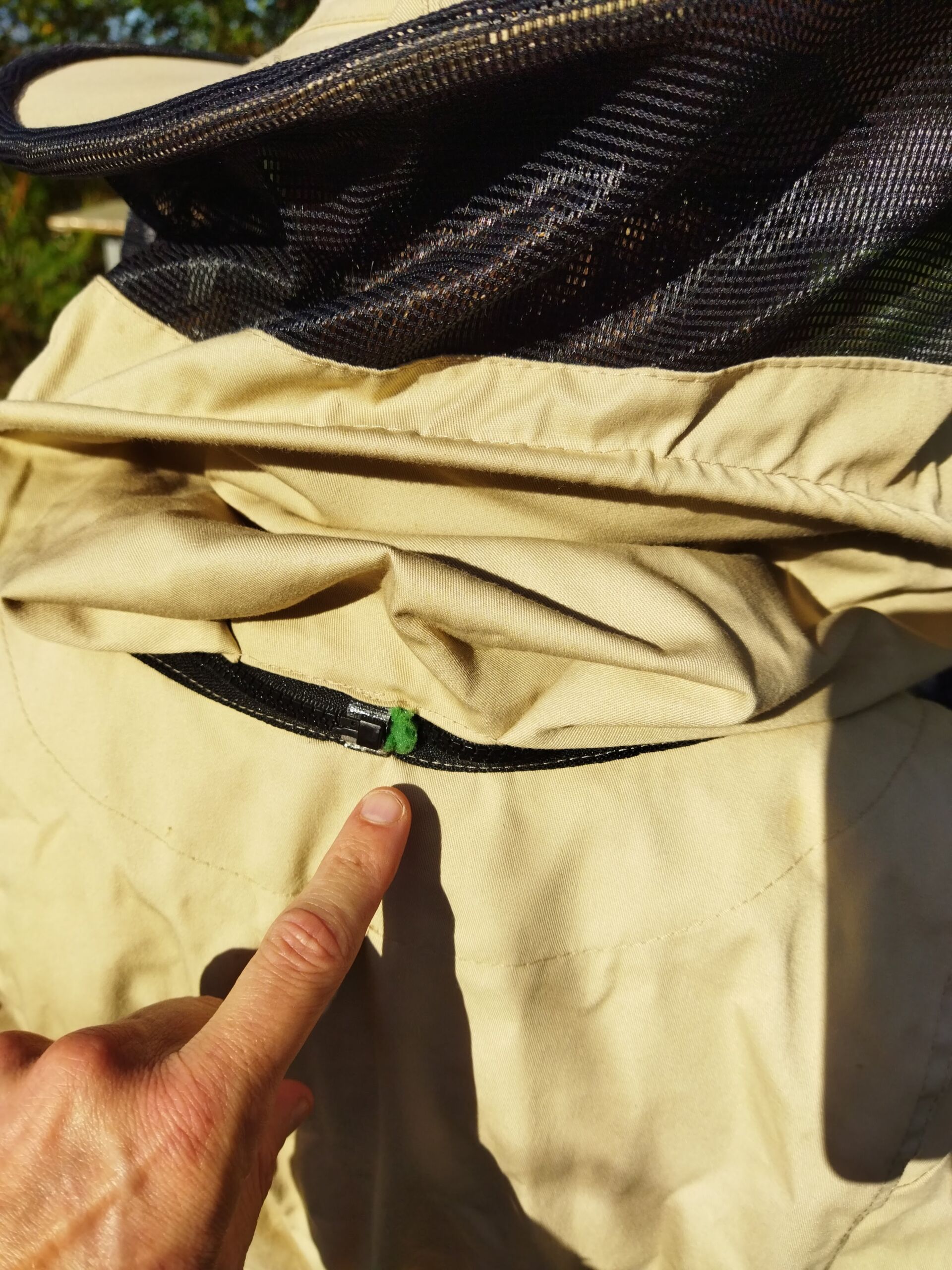 Erleak haserre daudenean erlezain trajearen edozein zirrikitutik sartzeko gai dira. Ez pentsatu nahikoa izango denik trajearen kremailerak ixtearekin eta belkroa pegatzearekin; sartzeko gai dira, zinez diot! Ez da txantxetarako kontua zure aurpegi aurrean, trajea pasa eta bizpahiru erle oso-oso haserre izatea… Eta ezin atera bertatik! Hasten dira orduan garrasiak, kolpeak aurpegian, zentzurik gabeko korrikaldiak; ihes egiteko ahaleginean etsaia barruan izanda! Eskarmentuarekin ikastea oso egokia iruditzen zaidan arren, hobe egoera desatsegin hau aurrezten baldin baduzu. Beraz, lehenik eta behin, ondo ikasi 3. lezioa, eta horretaz gain erlezain trajearen zirrikitu guztiak ondo tapatu (belaki zati bat erabili horretarako, argazkian adierazten den moduan).