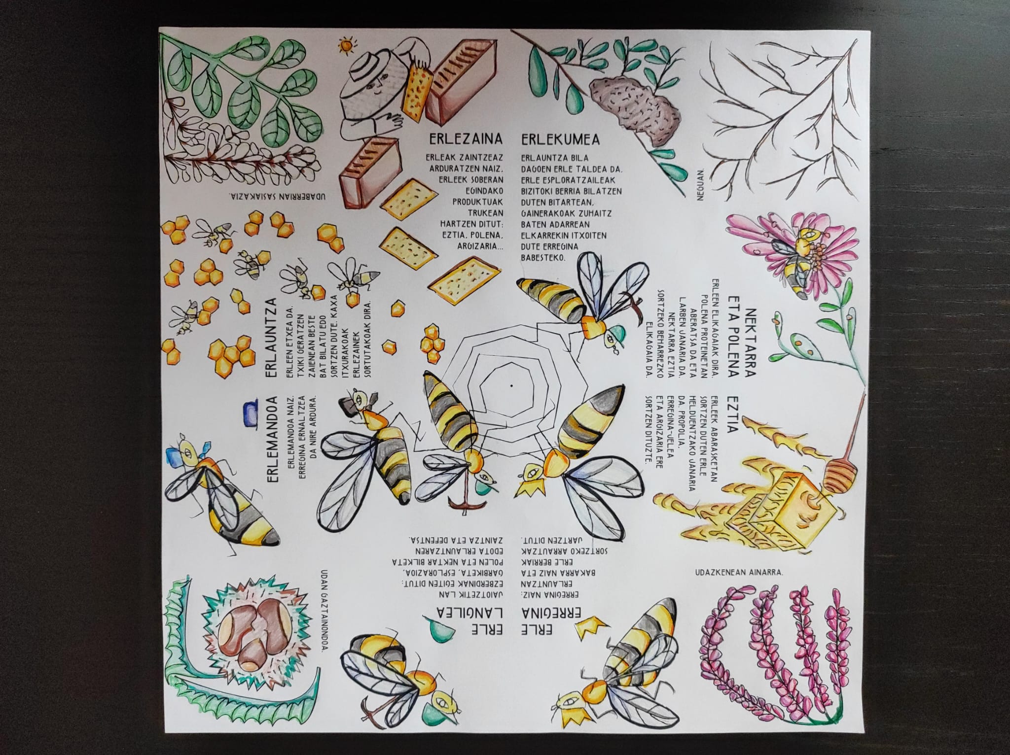 - Koloreztatu eta ezagutzak bereganatu: erleak identifikatzea (erregina, langilea, erlemandoa), gertuko loreak desberdintzea (gaztain-lorea, txilarra, akazia-lorea), eta sortzen dituzten produktuak zeintzuk diren ezagutzea.