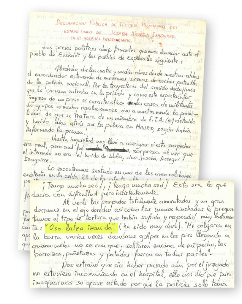 Arregi bederatzi egunez eduki zuten Madrilen mekrominarekin “hilduratzen”, Xabier Mendigurenek Oso latza izan da (Elkar, 2023) liburuan deskribatu lez. Horiek izan ziren bere azken hitzak, Carabanchelgo ospitalean ziegakideei esanak. 45 urte igarota, 5.379 tortura kasu ditu zenbatuta Euskal Memoriak. Gehiago izango dira, badakigu.