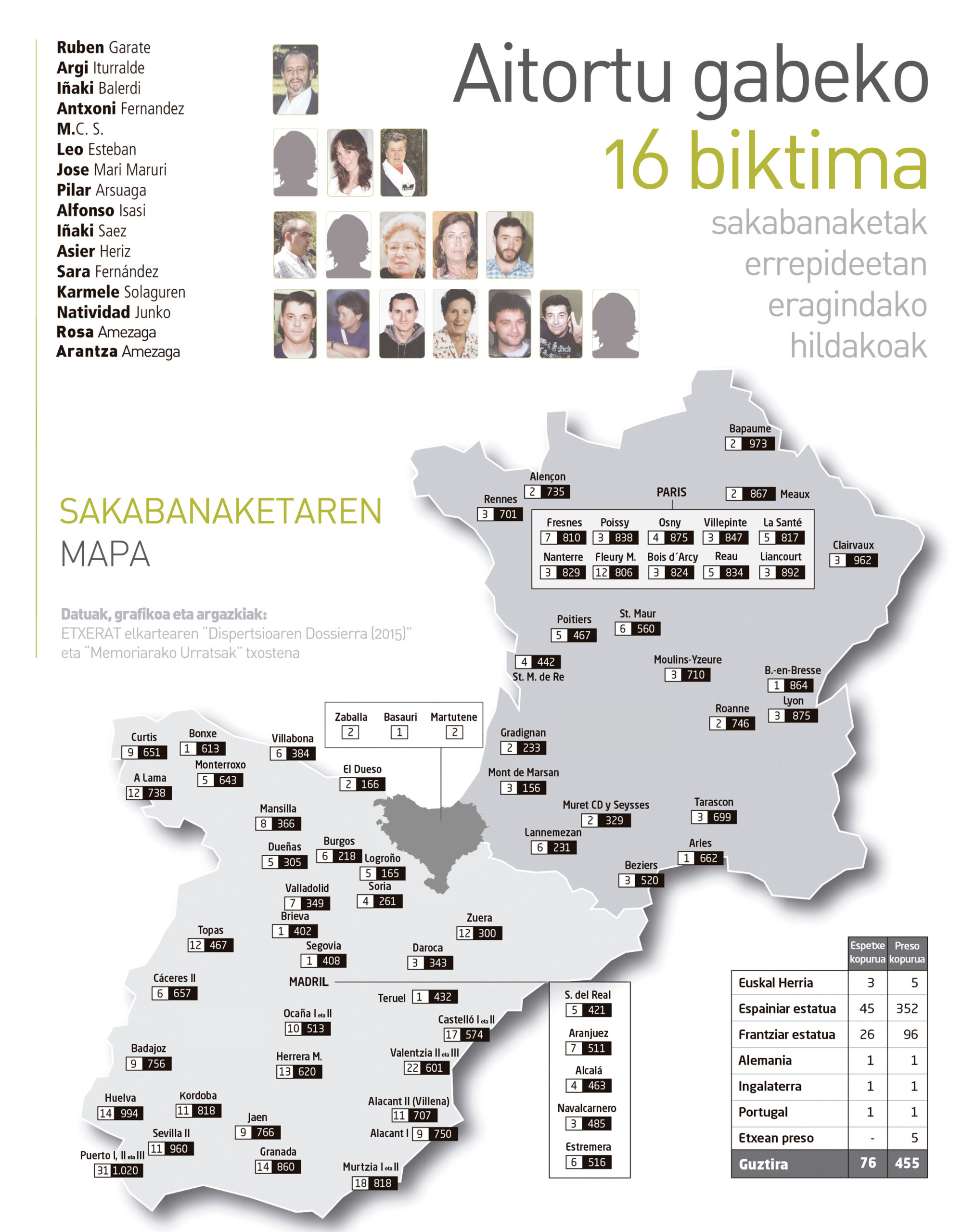 Etxeratek argitaratutako “Memoriarako urratsak” txostenean jaso dute gaur egunera arte sakabanaketa politikak erangin dituen biktimen zerrenda. 16 euskal herritarrek galdu dute bizitza errepidean, beren lagun edo senideak zenbait minutuz ikusi ahal izateko bidean. Euskal Herriko gatazkaren kontakizuna idazten hasi nahi den unean, oraindik badira horren alderik ilunenetako bat sufritzen ari direnak. Multzo horretan daude milaka eta milaka lagun, astero ehunka kilometro egin eta ehunka euro xahutu behar dituztenak gorrotoan oinarritutako politika ankerraren erruz; orain dela 26 urte PSOEk agindu zuen sakabanaketaren erruz.