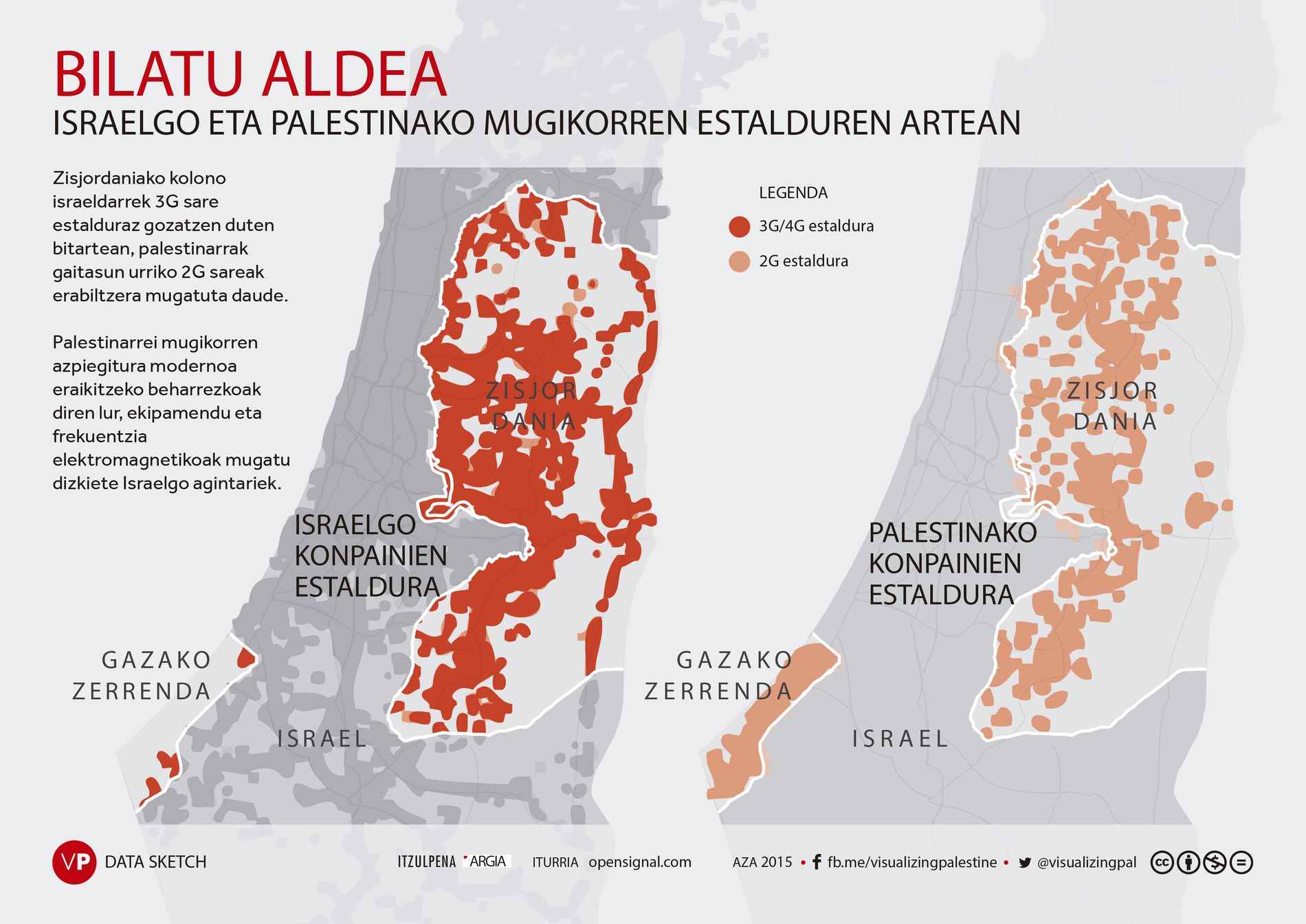 Zisjordaniako kolono israeldarrek 3G edo 4G sare estaldura azkarraz gozatzen duten bitartean, palestinarrak gaitasun urriko 2G sareak erabiltzera mugatuta daude. Palestinarrei mugikorren azpiegitura modernoa eraikitzeko beharrezkoak diren lur, ekipamendu eta frekuentzia elektromagnetikoak mugatu dizkiete Israelgo agintariek. Okupazioaren eragin zuzena maila horretara ere heltzen da. Kalitate handiz deskargatzeko: VP-Mugikorrak-basque.pdf