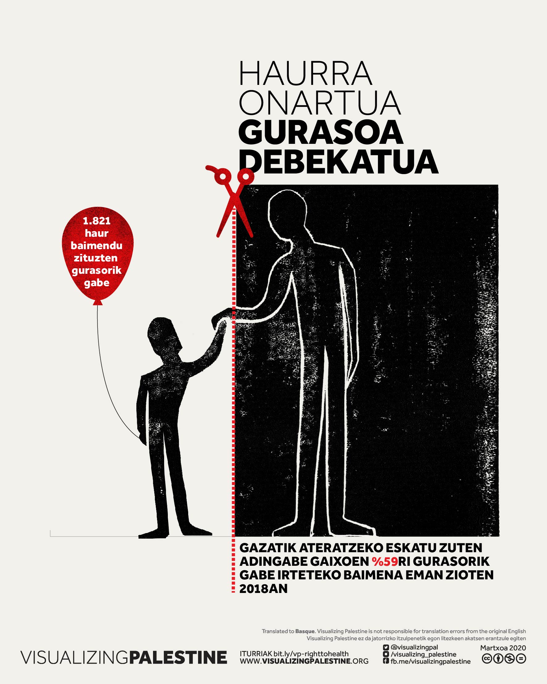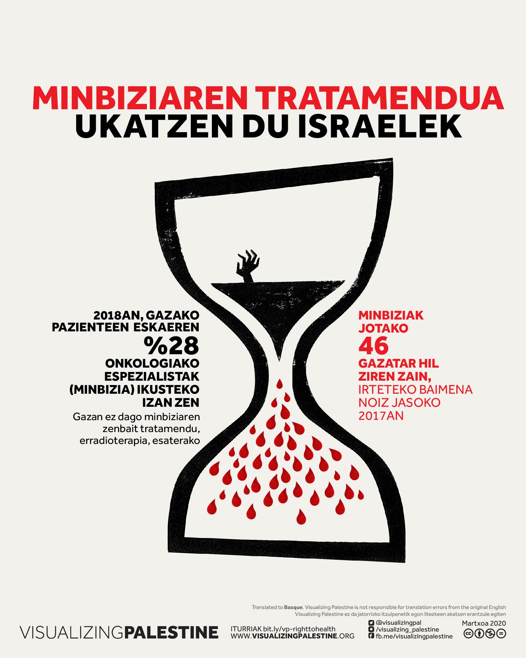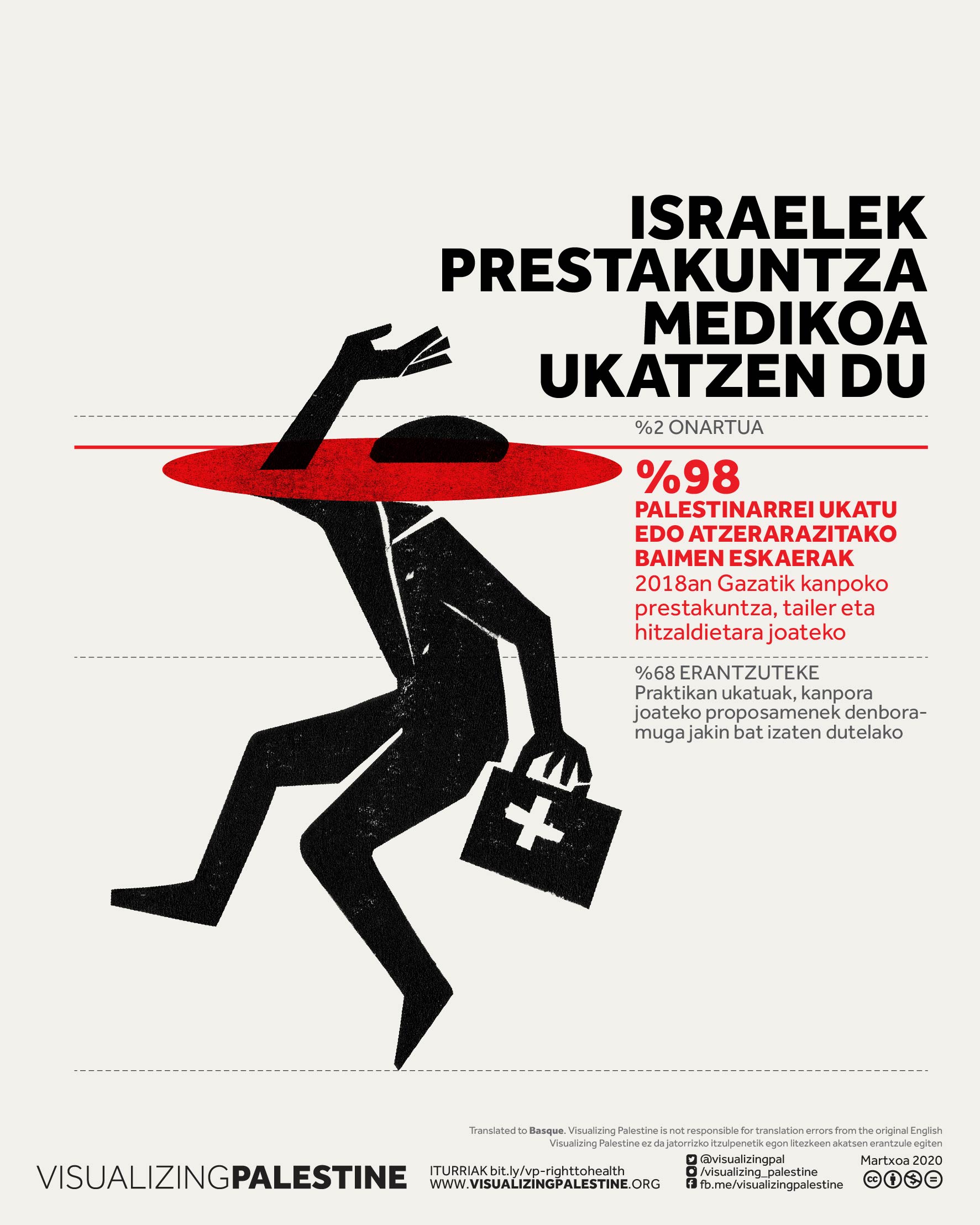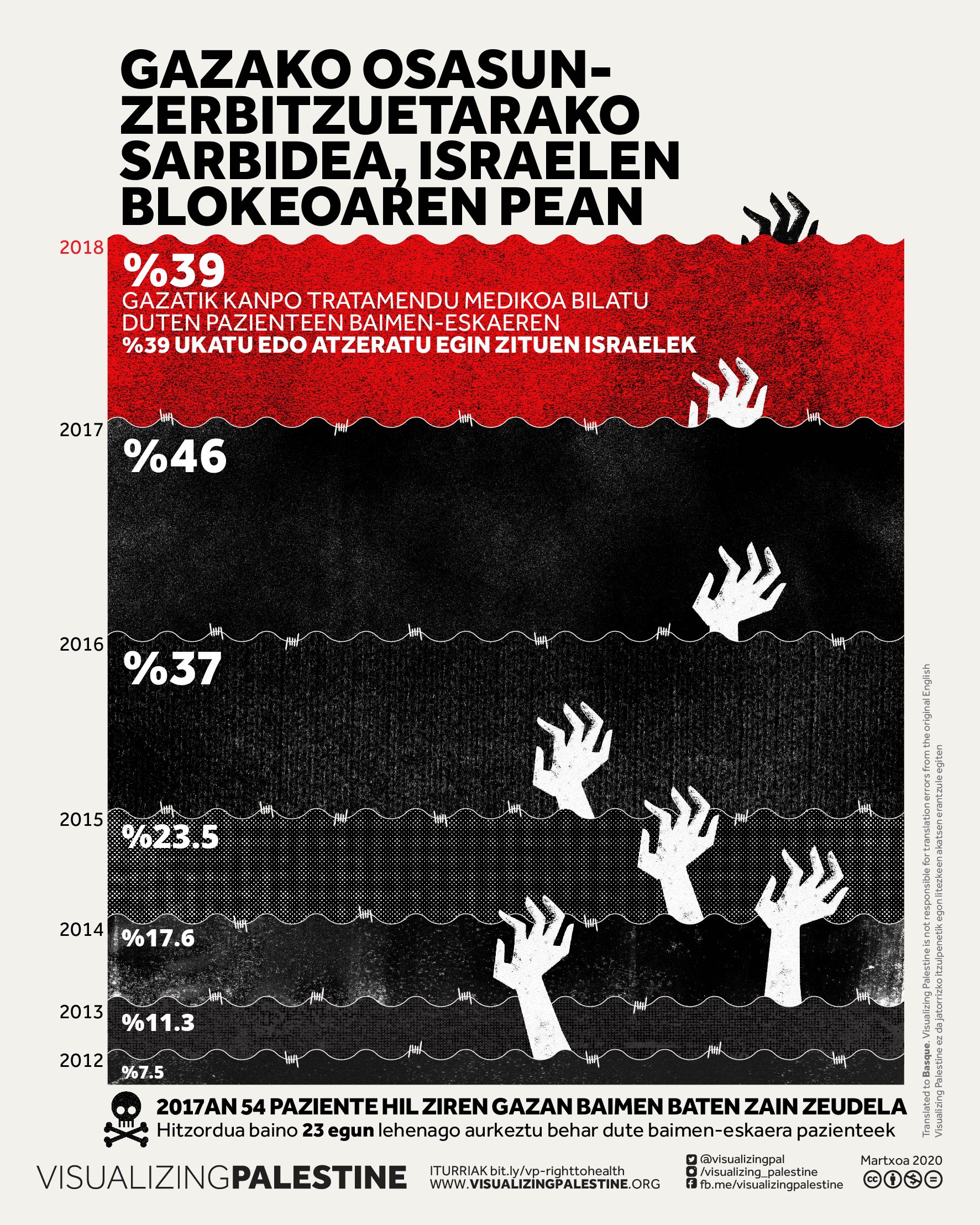 Visualizing Palestine kolektiboak egindako infografia hauek Osasunaren Mundu Erakundearen datuetan oinarrituta daude, Gazan konfinatuta bizi diren bi milioi palestinarri –horietatik 1,4 milioi errefuxiatuak dira– osasun eskubidea ukatzen dielako Israelek.