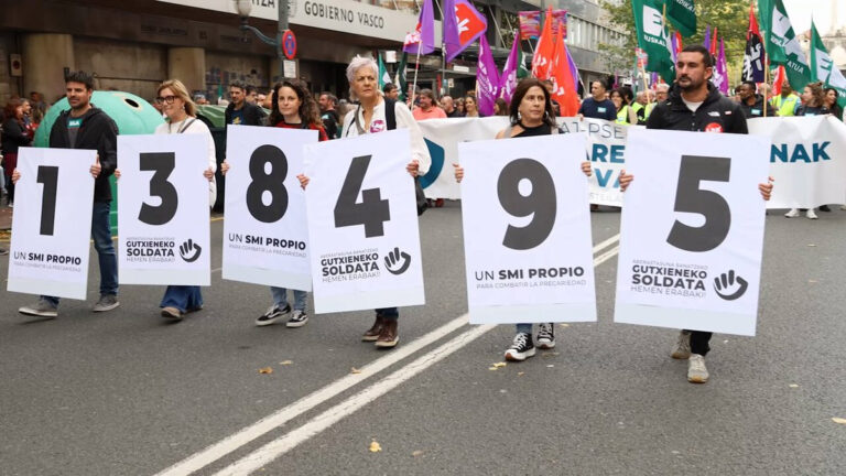 Eusko Jaurlaritzak, bere aldetik, gutxieneko soldatak hobetzea patronalaren eta sindikatuen ardura dela dio, eta lan hitzarmenen bidez adostuta lortuko dela hori. Baina biak maila berean jarrita, ez al zaio betorako eskubidea ematen mugitzeko interes gutxien duenari? Patronalari?Hain justu, beto hori gainditzeko aurkeztu zuten ELA, LAB, ESK, Steilas, Hiru eta Etxalde sindikatuek, 138.495 herritarren babesarekin, gutxieneko soldatari buruzko HEL herri ekinaldi legegilea Eusko Legebiltzarrean. Patronala mugiarazteaz gain, hitzarmen kolektiboetatik kanpo geratzen diren sektore prekarizatuenetan –emakumeak, pertsona arrazializatuak, gazteak…– dauden soldata arrakalak gutxitzea ere bada LGS propio bat lortzeko arrazoietako bat. Baina eztabaidatzeari uko egin diote Eusko Jaurlaritza sostengatzen duten EAJk eta PSE-EEk. Hemen ere arrazoi bera: ez dela erkidegoaren eskumenekoa.